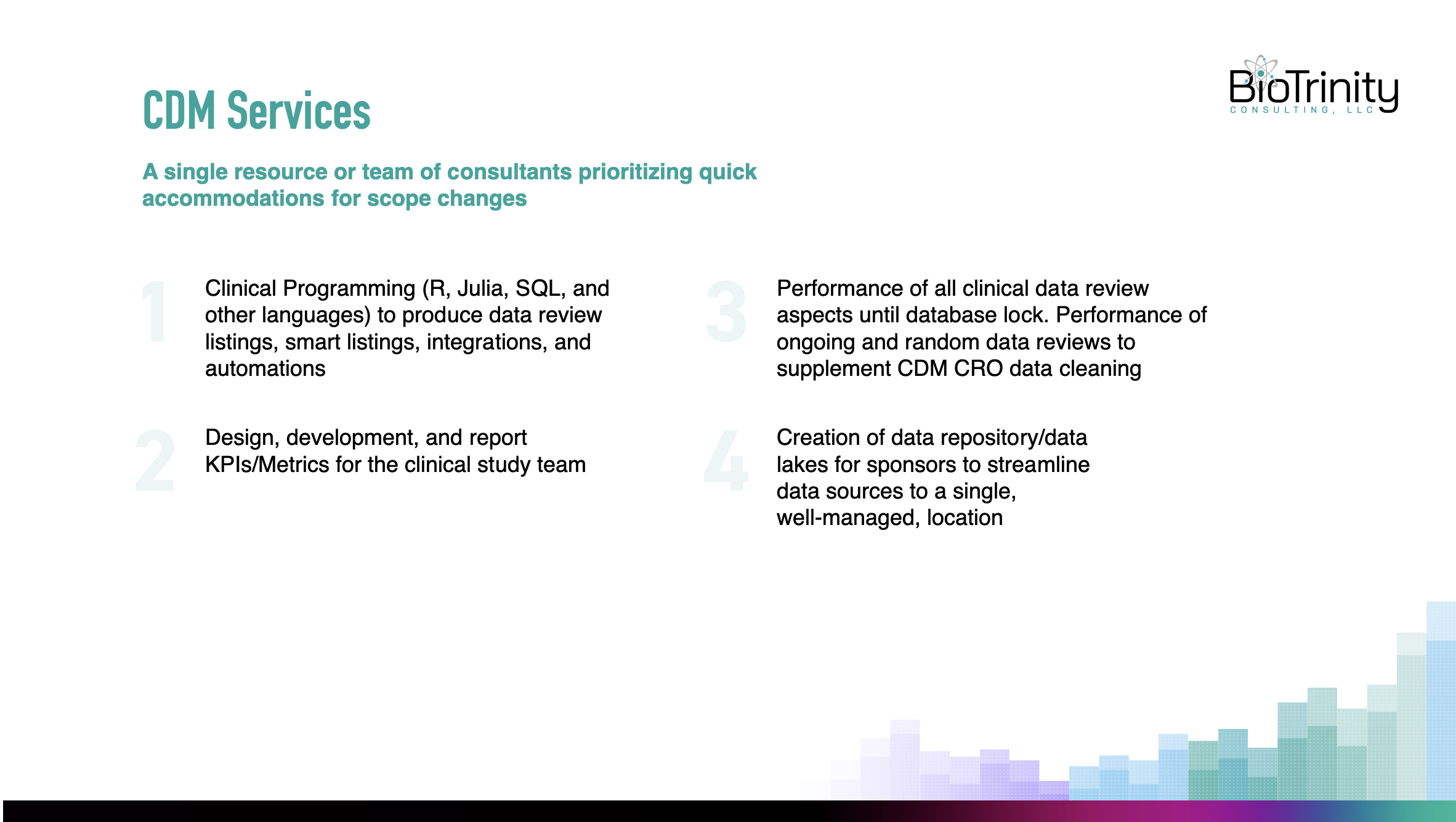 A clinical data management consultancy focused on clean, transparent, high-quality service delivery—with a visual identity and presentation style to match.